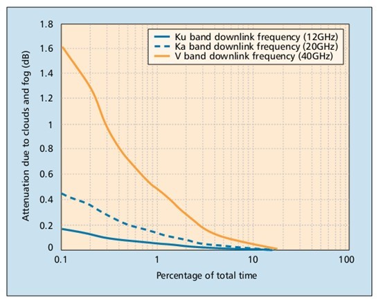 The liquid water content of clouds is the physical cause of cloud attenuation. Prediction models for this particular attenuation factor have been developed within the framework of ITU-R and elsewhere. Figure 4 depicts attenuation values due to clouds and fog exceeded for a certain range of probabilities. The ITU-R model was selected as the underlying prediction method for generating these curves, which correspond to the three frequency bands examined in this survey.