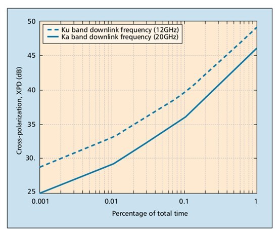 Differential phase shift and differ-ential attenuation caused by nonspherical scatterers cause signal depolarization. Although this phenomenon does not affect single polarized satellite systems, its effect becomes significant for systems reusing frequency by transmitting two orthogonally polarized signals for optimum RF spectrum utilization. In this case, depolarization results in cross-polar interference, i.e. part of the transmitted power in one polarization interferes with the orthogonally polarized signal. In Fig. 5 the relevant ITU-R method has been employed to demonstrate the long-term statistics of hydrometeor induced cross-polarization in the Athens, Greece area. The cross-polarization dis -crimination (XPD) not exceeded for various percentages of time is shown only at the Ku and Ka bands, since validity issues arise for the proposed model at frequencies above 35GHz.