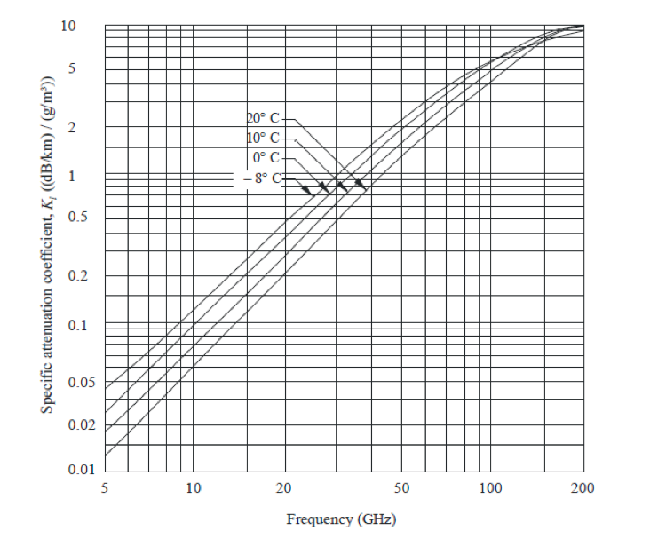 Cloud attenuation becomes increasingly important to consider for reliable satellite communications at frequencies above 10 GHz [1]. For clouds or fog consist of small droplets, less than 0.01 cm, the Rayleigh approximation is valid for frequencies below 200 GHz and it is possible to express the attenuation in terms of the total water content per unit volume [3]. The following equation can be used to obtain the attenuation due to clouds for a given probability: