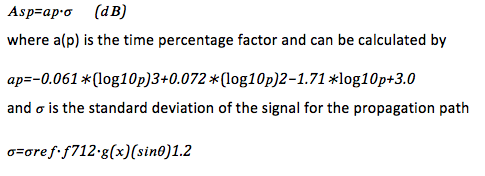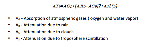 Variations in the magnitude and the profile of the refractive index of the troposphere lead to amplitude fluctuations known as scintillations [5]. The magnitude of scintillation is affected by increase in frequency, decrease in elevation angle, and decrease in antenna beamwidth. Tropospheric scintillation can cause serious degradation in performance at low elevation angles (≤10o) and at frequencies above 10 GHz. Ionoshperic scintillation may be important at frequencies below about 6 GHz [7]. The scintillation fade depth for the time percentage p can be calculated by: