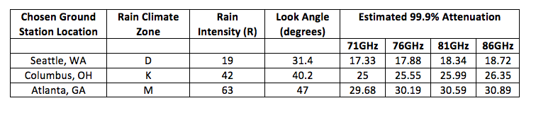 The chosen Satellite is present at 100.8ºW. The look angles for all the three locations are calculated and the worst case (horizontal polarization) rain attenuation estimates of these three locations are shown below.