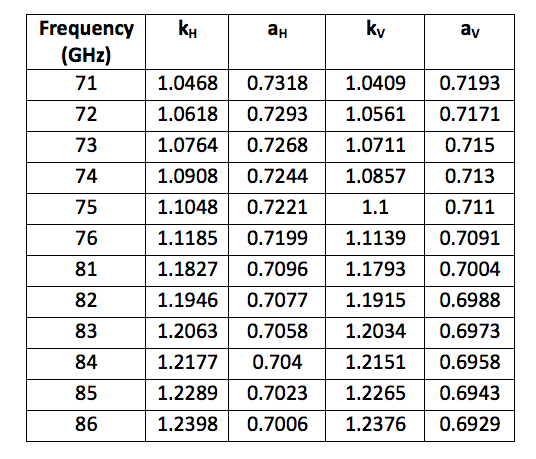 The rainfall rate intensity, and the estimated frequency dependent coefficients k and ∝ for 71-76 GHz and 81-86 GHz can be obtained from Table 5.